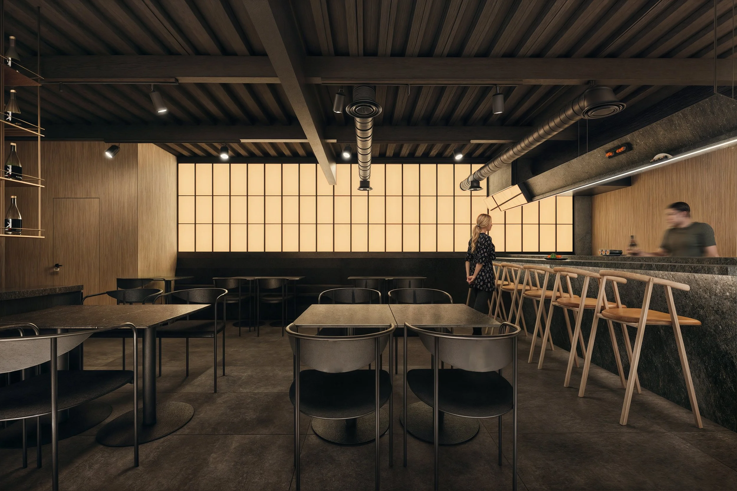 The remodel increased seating capacity, harmonized the identity of both brands in every detail and added an intimate sushi nook on the upper floor.//La renovación optimizó la capacidad de comensales, unificó las identidades de identidad de las marcas en cada detalle y añadió un íntimo rincón de sushi en planta alta.